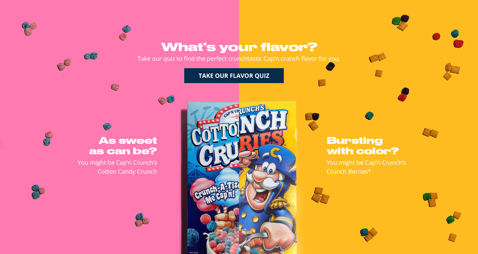 The website starts with a full-screen red background, crunch pieces and a giant cereal box move through the space using parallax to make the user feel like they are floating